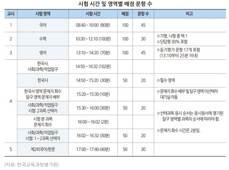 올해 수능 원서 접수기간은 8월 22일부터 9월 6일까지 12일간이며 성적통지표는 12월 4일 배부된다. 졸업생이나 검정고시 수험생 등은 수능 성적 온라인 제공 사이트에서 수험생 본인 명의 휴대폰 또는 아이핀 인증을 통해 성적통지표를 발급받을 수 있다.